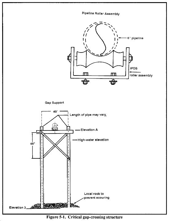 (3) Critical Gap Structure. This structure is available through AFCS and is used for crossing small streams and gullies. It is made up of 4-inch-diameter steel tubing, angled steel, and roller assemblies (Figure 5-1). The rollers are installed so the pipeline can move during expansion and contraction. The structure is field-fabricated on-site with welding equipment. Each structure is placed at an interval equal to the length of a stick of pipe, with the coupling positioned directly between the structures.