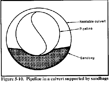(1) Culvert Size. A culvert 4 inches larger in diameter than the pipeline will provide sufficient clearance for the pipeline. If possible, it with sandbags (Figure 5-10). Anchoring the pipeline at each end of the culvert is best.