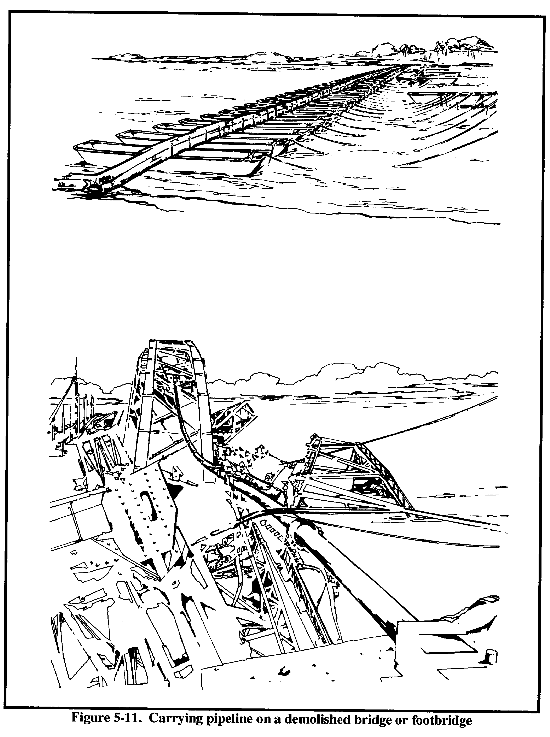 (4) Improvised Structures. Figure 5-2 shows improvised methods of supporting short spans of unsupported pipeline. In emergencies, you can use damaged or demolished bridges or floating footbridges (Figure 5-11) to carry a pipeline. However, construct alternate lines as soon as possible. This is especially true when lines are carried on floating bridges that are unstable and subject to hazards from floods, floating debris, derelict boats, and floating explosive charges placed by enemy partisan forces.
