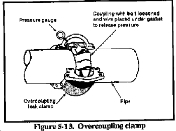 (g) Inspect the test section and mark leaks. Leaks are detected by sight or by feel. Slight leaks can often be eliminated by shaking the joint. To do this, place a pick handle, crowbar, or similar lever under the coupling and lift the coupling quickly several times. If you cannot correct small leaks at couplings, mark the couplings and estimate the quantity of the leak. If a large leak occurs, shut down the pumping station, temporarily install an overleak clamp, and resume testing. Locate all leaks before emptying the line to make repairs. While the leaks are being marked, the line pressure is monitored at each end.