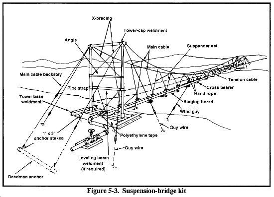 (c) Suspension-bridge kits. These kits (Figure 5-3) are available in 100-, 200-, and 400-foot spans. Detailed assembly instructions come in the packing list for each kit. If suspension kits are not available, expedient-crossing structures can be constructed.