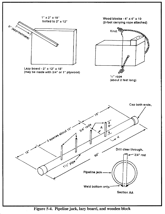Depending on the terrain and job assignment, the crews may need additional equipment, such as crowbars, brush hooks, axes, machetes, saw, shovels, hand auger, hatchet, large nails, long bolts, and crescent or open-end wrenches. The pipeline jacks, lazy boards, and wooden blocks are field-fabricated (Figure 5-4). All other tools come in the grooved-coupling, pipeline-construction tool kit or as part of the component packing list. To couple pipe--