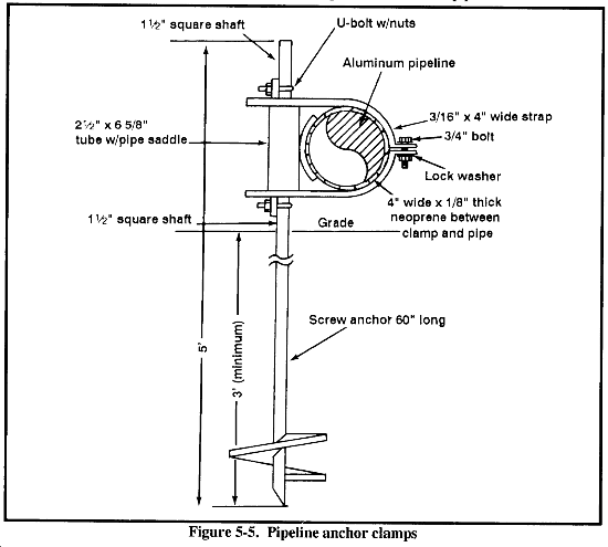 (10) Anchor the Pipeline. Because anchoring is not a manpower-intensive task, a long length of pipeline is constructed before anchoring is required. The anchoring crew is usually a two-soldier team. They should anchor every 1,000-foot section of aluminum pipeline midway between the expansion loop. Doing so allows for expansion and contraction due to temperature and pressure. Paragraph 5-2b discusses expansion devices. The crew installs a screw-type anchor (Figure 5-5) using a hydraulic drivehead attachment that can be put on a JD410 or a SEE boom. The coupling-crew leader should establish a method of marking the pipeline for anchor installation. After installing the anchor, the crew connects it to the pipeline with a metal clamp lined with a piece of rubber. They must be careful not to move the pipeline out of alignment during the anchoring procedure.