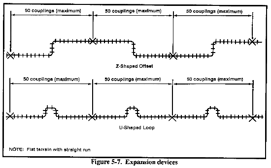 b. Expansion and Contraction of Coupled Pipelines. Surface-laid metallic pipe expands and contracts with changing temperatures. Groove-type couplings provide some angular deflection and slack adjustment between each pipe joint (Figure 5-6). Because aluminum expands and contracts more than steel, control devices (expansion loops) are required to relieve the tension in the pipeline caused by thermal expansion and contraction. Aluminum pipeline is anchored every 1,000 feet, and an expansion device is installed in the center of every 1,000-foot section. The maximum expansion with a differential in temperature of 100 degrees can be as much as 15 inches. The U-loop and Z-loop are two types of expansion devices (Figure 5-7).