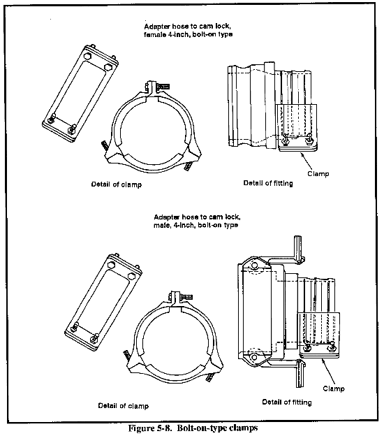 a. 600-Foot, 6-Inch Hose-Reel Assembly. This system is an upgrade to the 250-foot, 6-inch lightweight hose (stored in flaking boxes). The hose-reel system consists of 600 feet of 6-inch lightweight hoses packaged on reels, with two reels mounted on a skid. The MAWP is 150 psi. The hoses do not have attached connecting ends. They will be attached, using a bolt-on-type clamp at assembly time. (Figure 5-8 shows bolt-on-type clamps.) The hose line is manually deployed and has a 24-volt, direct-current, hydraulic power pack for recovery. Six reel systems (two 600-foot reels per system) and one power pack can fit into one ISO container. The reel system eliminates the bending and stressing of the hose and increases the storage life 1 1/2 to 2 times longer than the hoses that are stored in flaking boxes.