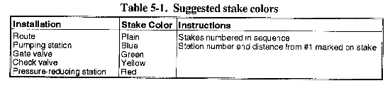 (1) Stake Pipeline Route. Marking crews, working ahead of construction crews by at least one day, stake out the final location of the pipeline and its installations using wooden stakes. If clearing and leveling are required, they must mark the route in advance. These markers should be visible, one from the other, at maximum intervals of about 500 feet. The crew leader should be experienced in pipeline construction. Good layout can greatly reduce the construction effort. Markers can be color-coded to furnish detailed information to construction crews. Table 5-1 lists suggested stake colors for various types of installations.