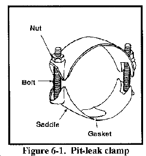 (1) Pit-Leak Clamp. Small-caliber bullets can make holes in a pipeline. Rust can eat holes in the wall of a pipe. These small holes are called pit leaks; use a pit-leak clamp (Figure 6-1) to repair any leaks. If possible, drive small wooden pegs into the holes to stop the leaks until you install a clamp. To mount a pit-leak clamp--