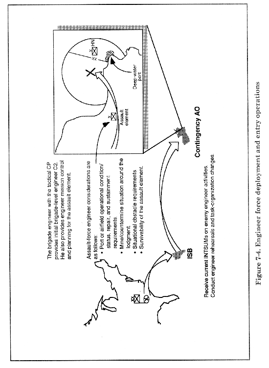 The division and corps normally echelon engineer C2 early in the deployment sequence based on the level and density of engineers in the theater (see Figure 7-4). Sometimes this is not the case, and the brigade engineer is the senior engineer initially on the ground for a brigade assault force occupying a lodgment. Then he becomes the Army force or JTF engineer responsible for orchestrating the engineer support for the close, deep, and rear battle. The brigade engineer should be concerned with the current status of M/S planning for the first phase of the operation, specifically the following: