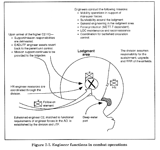 The combat operations stage is an extension of the deployment and entry operations stages. The focus of this stage is to complete the buildup of combat power (if not already accomplished during the previous stage) and quickly expand military operations. Figure 7-5 and Figure 7-6 depict examples of this stage. The key to execution is to place a force on the ground that can take the fight to the enemy while follow-on forces arrive in the lodgment area for subsequent operations. Engineer forces supporting combat operations are normally task-organized to maneuver TFs for mobility operations. These forces must be--