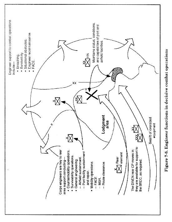 Once the brigade has closed, the priority of engineer effort shifts to supporting the maneuver force's involvement in offensive and, if required, defensive operations. If higher engineer C2 arrive late, the brigade engineer must shift his focus from the close, deep, and rear battle of the lodgment area to the close battle of his brigade sector (see Figure 7-8). With the introduction of heavy forces into the lodgment area, the maneuver brigade can be task-organized with a mix of armored and light forces; likewise, engineer forces can be task-organized with a mix of mechanized and light forces. When a mechanized engineer force is task-organized to a light TF, a CSS package must accompany the mechanized engineer force because it is beyond the capability of the light force's CSS structure to support them. Similarly, when a light engineer force is task-organized to a mechanized TF, transportation assets have to be provided so that the light force has battlefield mobility.