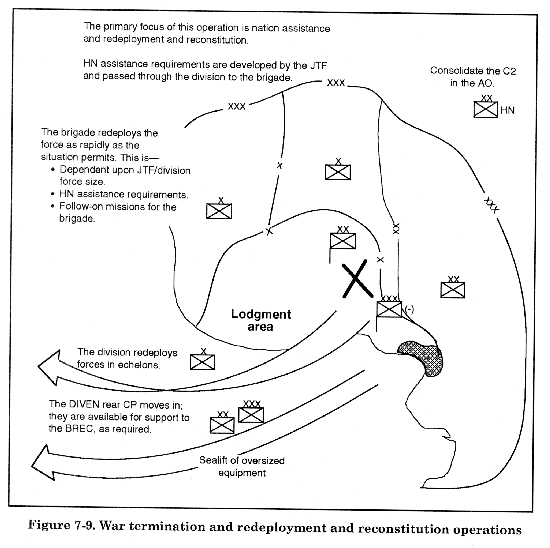 The objectives of this stage are to consolidate friendly control of the operational area, redeploy the force as rapidly as possible, and shift the operation from combat to peacetime engagement operations (see Figure 7-9).