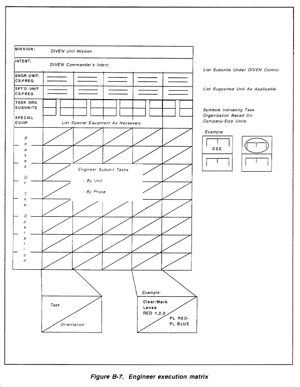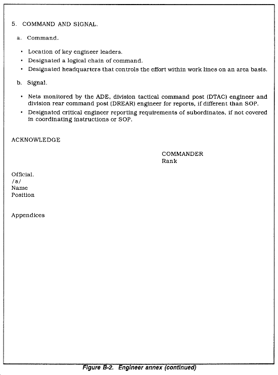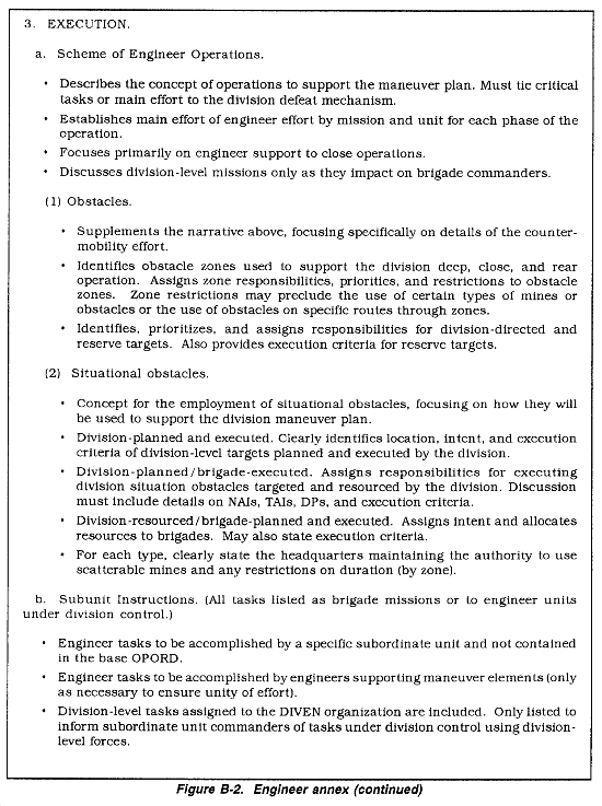 This appendix is divided into two major sections. The first section deals with the division OPORD and the engineer annex. This section provides the base format of the division OPORD, highlighting areas where the DIVEN commander may have direct input. It also outlines the format and content of the engineer annex as well as provides sample overlays. The second section focuses on DIVEN unit orders. It provides a format and content for the DIVEN unit WARNORD and OPORD, including possible annexes, overlays, and FRAGOs.