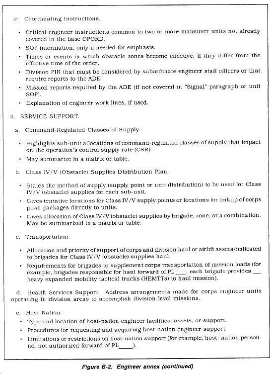 Engineer Annex. The engineer annex contains information not included in the base division order that is critical to the division engineer plan or required for subordinate engineer planning. It does not include instructions or orders directly to engineer units. All instructions or tasks are addressed to maneuver brigades, not supporting engineer units. More importantly, the engineer annex covers critical aspects of the entire engineer plan, not just parts that pertain to engineer units. The engineer annex is not a replacement for a unit order. For example, it does not give subunit orders and service support instructions to engineer units remaining under the DIVEN command; those orders and instructions are contained in the DIVEN unit order. The engineer annex should meet the following general criteria:
