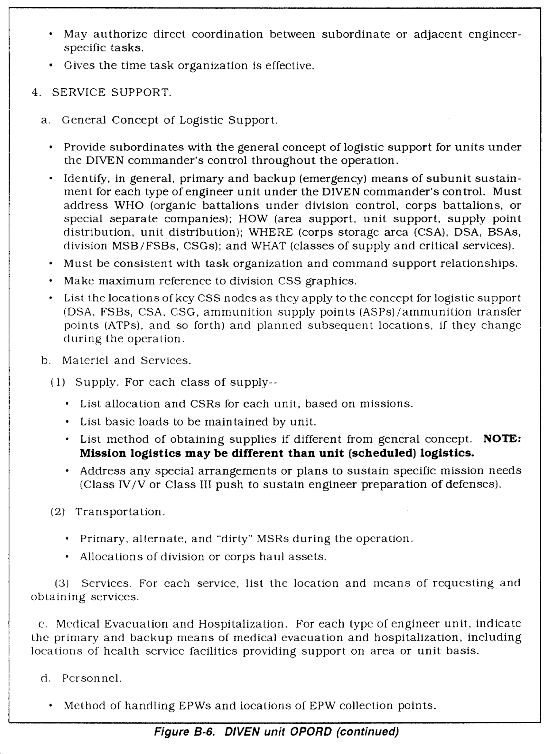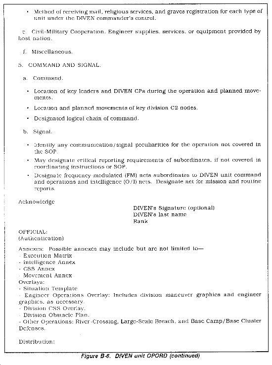 DIVEN Unit OPORD. The DIVEN commander issues OPORDs to all engineer units under his command. The DIVEN commander's OPORD may initially include any engineer unit operating in the division area as necessary to effect the task organization, assign missions, and establish sustainment responsibility at the outset of an operation. However, once the task organization is effected, all instructions and missions to engineers supporting maneuver brigades are conveyed in division orders and are addressed to the maneuver brigade commanders. The following is an outline of the content of DIVEN unit OPORDs using the standard five-paragraph field order (Figures B-6 and B-7). When the order is an OPLAN instead of an OPORD, assumptions on which the plan is based are included at the end of the "Situation" paragraph.