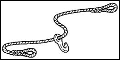b. Single Slings. A single sling is made of fiber or wire rope. Each end of the single sling is made up with an eye, a hook, a ring, or a thimble, depending on the intended use of the sling. A single sling may be used as a vertical sling, a basket sling, or a choker sling with a choker hitch (Figure 4-3). Single slings made of fiber rope are used for light loads and for cargo that might be damaged by wire slings. Slings made of wire rope have a variety of uses. They are made in lengths ranging from 5 to 150 feet or longer for special cargo. Running hook wire rope slings may be used to hoist drafts of lumber, dunnage, iron pipe, building steel, strong boxes, and large cases (Figure 4-4). Each running hook sling is made with 18-inch eyes at each end. Personnel use the sling by wrapping it around the draft, attaching one eye to the sliding hook, and putting the other eye on the cargo hook.