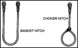 a. Endless Slings. Splicing the ends of a piece of wire or fiber rope makes an endless sling. It is simple to handle and can be used in several different ways to lift loads. The endless sling is most commonly used as a choker hitch. When the endless sling is used as a choker, personnel pass it around the draft or cargo forming a loop on top of the draft. The other end is passed through this loop, pulled tight and attached to the cargo hook. To balance the load, personnel spread apart the two parts of the sling on the bottom of the draft.