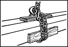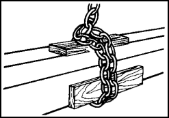 d. Chain Slings. These slings are used mainly for handling steel rails, pipes, beams, and angles. Chain slings are used in bridles or single legs (Figure 4-6). Cargo handlers should use dunnage between the chain and the draft to prevent slipping. If necessary, dunnage also should be used between individual pieces in the draft. When hoisting cargo of this type, cargo handlers should make a round turn (complete) with the chain around the draft. Cargo handlers also use chain choker slings (Figure 4-7). Chain choker slings are used to handle such cargo as steel rails, pipes, and steel beams. Cargo handlers place dunnage in such a way to give the sling a better grip. The sling's links are wrought iron; this iron will stretch before it breaks, thus giving warning. Other types of iron may simply crystallize and snap. Watch for warning signs such as stretching links, fracturing, and stretching hooks.