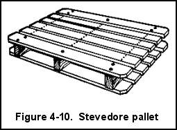 (1) A stevedore pallet, which is reversible, is used to handle loose cargo at water terminals (Figure 4-10). The standard stevedore pallet is 4 feet wide, 6 feet long and 8 inches high. The stringers are made of 3- or 4- by 4-inch lumber. The deck boards are made of lumber 2 inches thick. The outside boards may be random widths. The outside stringers are set in 4 to 6 inches from the ends so that a pallet bridle may be inserted. The inside stringers are arranged to permit easy entrance of forks for movement by forklift trucks.