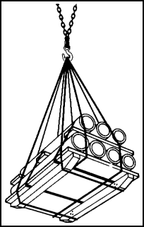 (1) Pallet bridles are used for quick, efficient handling of palletized cargo (Figure 4-17). Cargo handlers should insert the lifting bars at the bottom of the nets into the ends of the pallet to use the bridle. Then they should spread the sling nets around the cargo as far as they will reach and slip the eyes over the cargo hook. The bars at the top serve as spreaders.