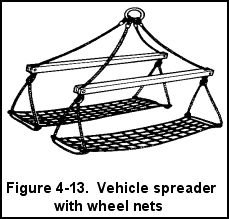 (3) Vehicle bridles are used for efficient handling of various types of vehicles. The size of the bridle depends on the size of the vehicle to be hoisted. Cargo handlers should use vehicle spreaders with wheel nets for passenger vehicles. Heavy-lift spreaders are used for trucks.