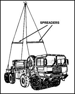 (1) A vehicle spreader is made of lengths of hardwood, pipe, or steel beams. It permits a straight pull on the sling and wheel nets. This keeps pressure away from the sides of the vehicle to be hoisted.