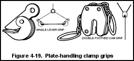 f. Plate-Handling Clamps. Plate-handling clamps are designed exclusively for handling steel plates. They are used to lift the plates into position to be properly slung with wire rope slings. They are safe for use only when the steel plate is not lifted to a great height. They are not used to hoist steel plates into or out of a hold. If the plates hit the coaming or the side of the hatch, it will release the tension and the clamps will drop the plates. The two most common types used in military cargo handling have serrated jaws and a 5-ton capacity (Figure 4-19).