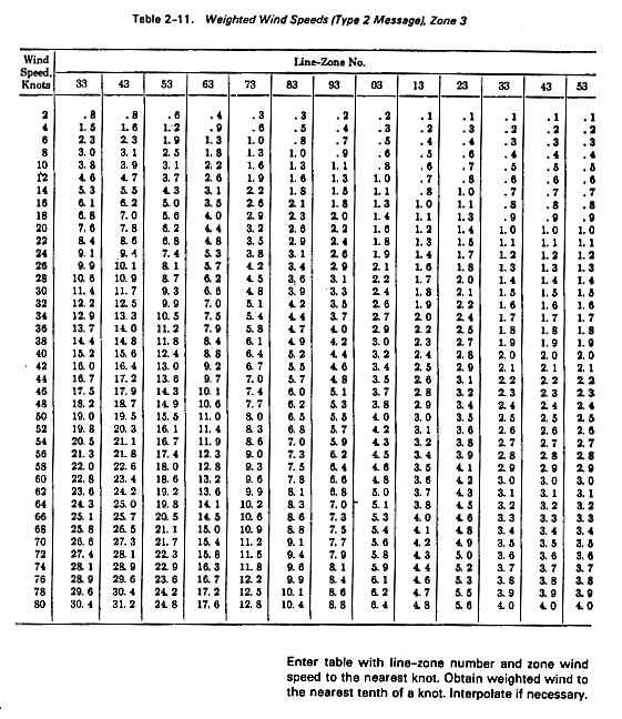 Table 2-11. Weighted Wind Speeds (Type 2 Message), Zone 3