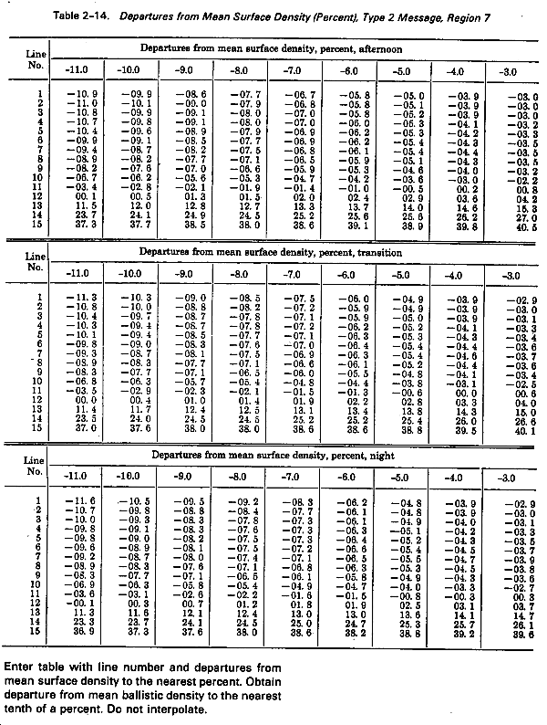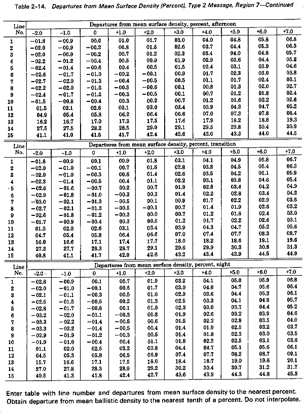 Table 2-14. Departures from Mean Surface Density (Percent), Type 2 Message, Region 7