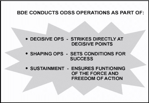UO will be conducted within the operational framework of decisive, shaping, and sustainment operations (FM 3-0 [100-5]). Army units will conduct offensive, defensive, stability, and support (ODSS) operations within the operational framework shown in Figure J-1. These operations comprise the spectrum of UO that a brigade must be prepared to conduct (Figure J-2).