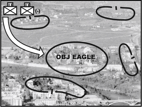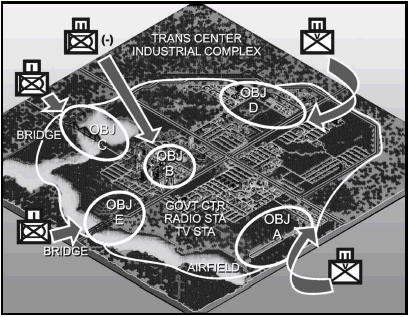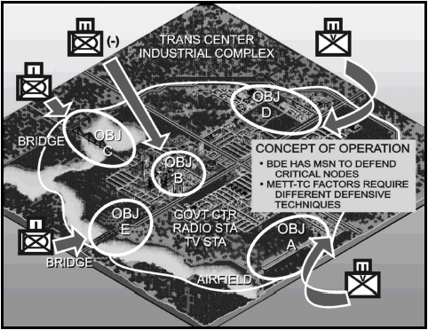 Note: TF operational graphics were drawn in order to provide an example of a possible technique that may be employed within the brigade AO in order to meet the brigade commander's intent. For example, the TF defending the transportation center has elected to use a perimeter defense for inner security and has assigned the attached mechanized infantry company team the mission to conduct outer security by means of a screen and manning the designated brigade OP.