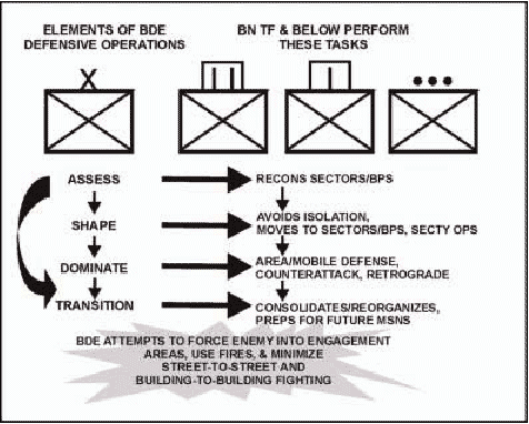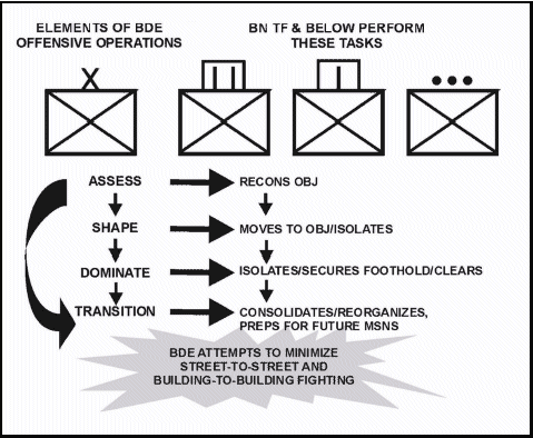 During operations within large cities, a brigade would probably participate as part of a division level operation. In offensive operations, the brigade may have to assist with isolating the objective, dominating (securing footholds, seizing and/or clearing buildings) an objective(s) within the city, and transitioning from combat to stability and support operations. In defensive operations, the brigade may be assigned the task to defend from a large urban area or the brigade may integrate smaller urban areas into its defensive scheme.