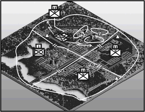(6) Engage the Entire Enemy Force. Threat forces may "hug" brigades operating in an urban area to avoid the effects of high-firepower standoff weapon systems. They may also try to keep all or significant portions of the brigade engaged in continuous operations to increase their susceptibility to stress-induced illnesses. UO, by their nature, produce an inordinate amount of combat stress casualties and continuous operations exacerbate this problem. The threat may maintain a large reserve to minimize the impact of this on their own forces.