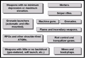(5) Employ Urban Oriented Weapons. Whether they are purpose-built or adapted, many weapons may have greater than normal utility in an urban environment while others may have significant disadvantages. Urban threat weapons are much like the nature of urbanization and the urban environment―inventive and varied. Small, man-portable weapons, along with improvised munitions, will dominate the urban environment. Figure J-4 lists examples of threat weapons favored in UO.