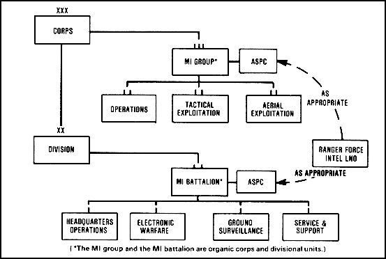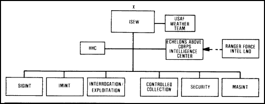 b. The theater or JTF commander is responsible for providing intelligence support. The 1st SOCOM also provides information and analyzed intelligence to the ranger force commander. The main source of processed intelligence is the Echelons Above Corps Intelligence Center (EACIC), similar to the division level military intelligence (MI) all-source production center (ASPC). The EACIC provides intelligence, security, and electronic warfare (EW) interfaces (see Figure 7-1). It is through the EACIC that ranger commanders can request support from national, joint, combined, or CONUS intelligence analysis systems.