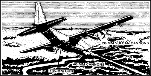 (c) If the enemy ADA ability is not great or it can be degraded to a low level, the ranger force uses specially equipped and armed AC-130 aircraft (see Figure 7-6) for fire support. These aircraft provide an invaluable combination of firepower, night observation and illumination, communications, and long loiter time. A well-planned and executed suppression of enemy air defense (SEAD) program, coupled with ECM directed against enemy ADA units, normally permits the use of AC-130 aircraft.