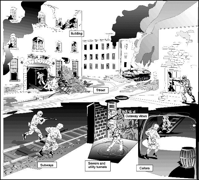 APPENDIX I Military Operations in Urban TerrainThe company team may take part in large-scale urban combat operations as part of a larger force. The team may also have to conduct MOUT when maneuvering separately; situations might include enemy contact in a very small village (10 or fewer buildings) or in a lateral strip area (along a road or highway). This appendix examines the basic characteristics of MOUT as well as special planning considerations and techniques of offensive and defensive operations. For more detailed information, refer to FM 90-10 and FM 90-10-1. |