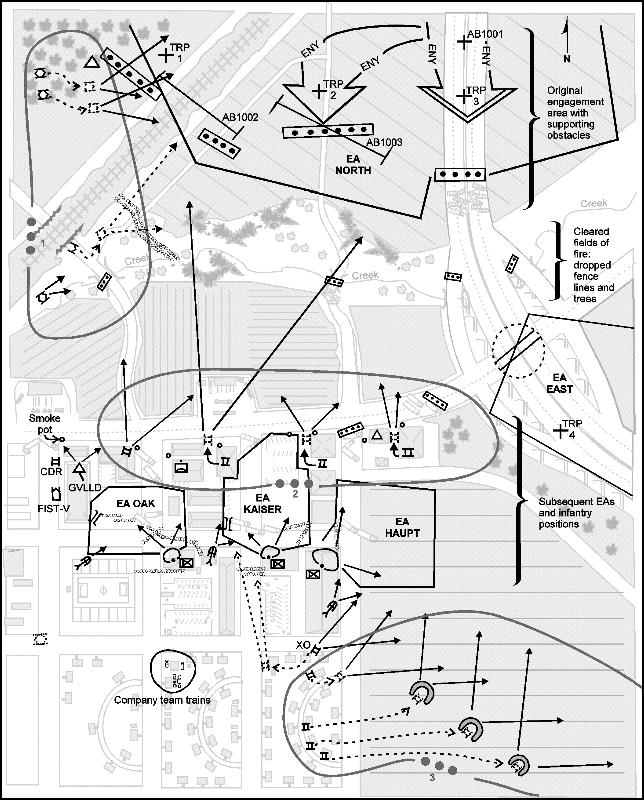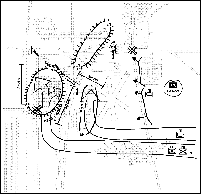 In house-to-house and street fighting, tanks and BFVs move down the streets protected by the infantry, which clears the area of enemy ATGM weapons. The armored vehicles in turn support the infantry by firing their main guns and machine guns from a safe standoff range to destroy enemy positions. (NOTE: Refer to Figures 3-24 and 3-25 for an illustration of the mutual overwatch techniques that are required during combined operations in restricted areas.) Figure I-4 illustrates a task force attack in a MOUT environment. |