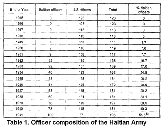 inflated salaries, to get the program started. Still, the requirement to learn elementary Creole proved an impediment to many would-be volunteers. Initially, a contingent of 120 U.S. Marines provided training for 2,600 Haitians, and by February 1916, the new gendarmerie began its duties.28Thereafter, the commissioning of Haitian officers occurred little by little, through promotions from the enlisted ranks. The creation of the École Militaire in 1928 formalized the process and improved the preparation of officer candidates for what came to be known as the Garde d'Haiti. In any event, Americans remained on top of the command hierarchy.