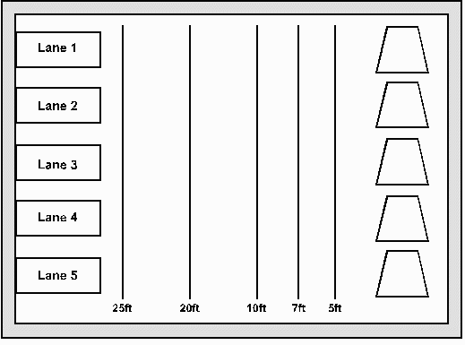 Figure 6 the live-fire range is where soldiers execute the quick fire drill from the stationary position and while moving forward, left, right and backward. Soldiers had to hit 100 percent of E- type targets at the 5-ft, 7-ft, and 10-ft lines before advancing to the next line. Eighty percent target hits were required at the 20-ft and 25-ft lines. The squad leader's assessment of the soldier's confidence in the drill was also required for advancement to Phase III. We conducted Phase III-V all in the same buildings.