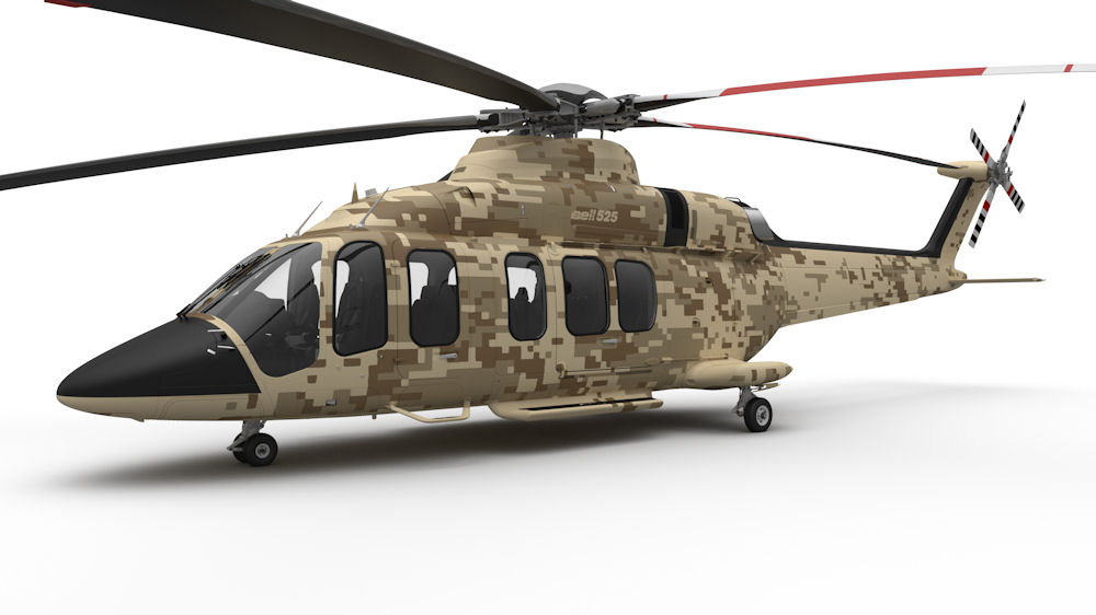 Based on a clean sheet design incorporating advancements in engine, airframe, drive system and avionics designs, the Bell 525 meets current FAA and EASA safety standards — including bird strike protection, drive system loss of lubrication, fatigue, and damage tolerance. Operators benefit from improved fuel efficiency and lower direct operating costs. Designs released by the airframer show a 20-passenger configuration, using four rows of five seats each. Fielding a military variant of the 525 “is being discussed” but for now will take a backburner as Bell concentrates on gaining certification for the civil design. Discussion of a militarized 525 is “almost inevitable” due to its rugged airframe that meets all the latest amendments to FAA Part 29 certification requirements and its FBW flight controls.