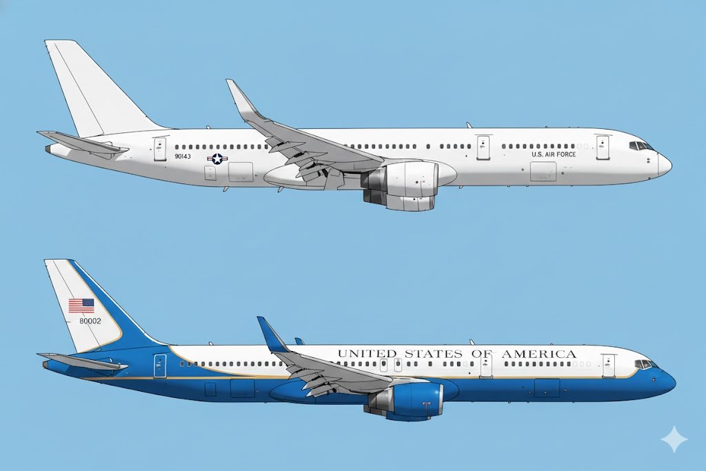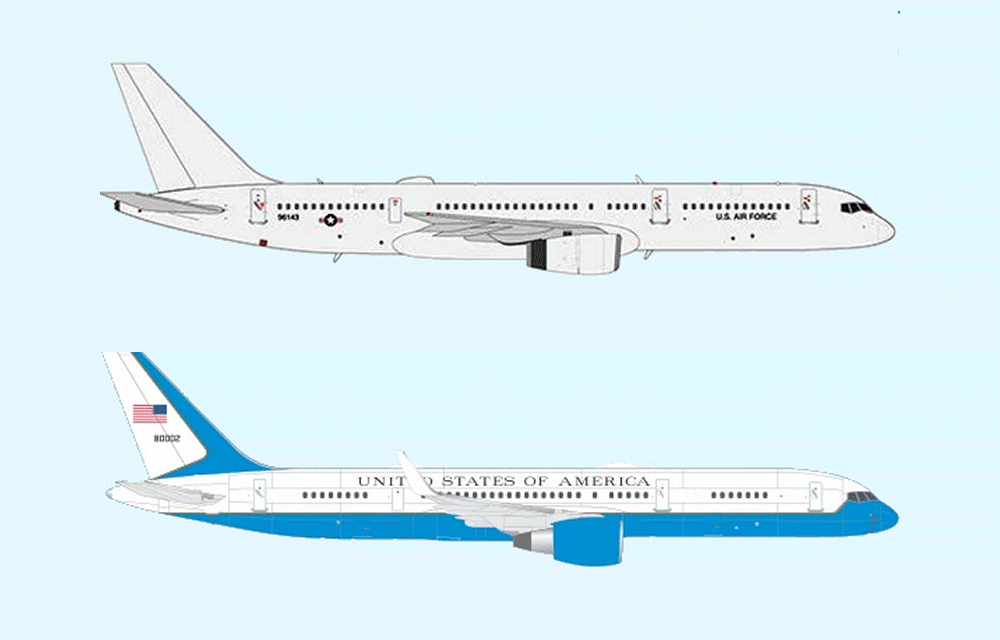 The C-32B represented a significant departure from the more commonly observed C-32A variant, which served as the primary transport for the Vice President of the United States and other senior government officials. C-32A aircraft have a visible blue-and-white paint scheme with the words "United States of America" to publicly identify them as official government transport, while C-32B aircraft use a nondescript white paint scheme for missions with less public visibility. While the A variant operated with full government livery and high-visibility markings appropriate to its ceremonial and diplomatic role, the B variant was configured for clandestine operations with minimal visual identification. The aircraft bore only a small American flag positioned forward of the rear passenger door, eschewing the standard military markings, tail numbers, and other identifying features that characterized conventional military transport aircraft.