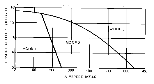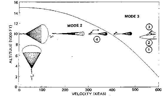 The drogue is not severed until after the recovery parachute has been deployed. Mode 3 is used for high altitude ejection allowing the seat to descend or decelerate into the Mode 2 parameters prior to Mode 2 recovery being initiated. Mode selection is performed by the recovery sequencer in conjunction with an environmental sensing subsystem which determines airspeed and altitude conditions independent from aircraft systems (4).