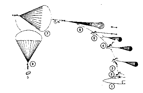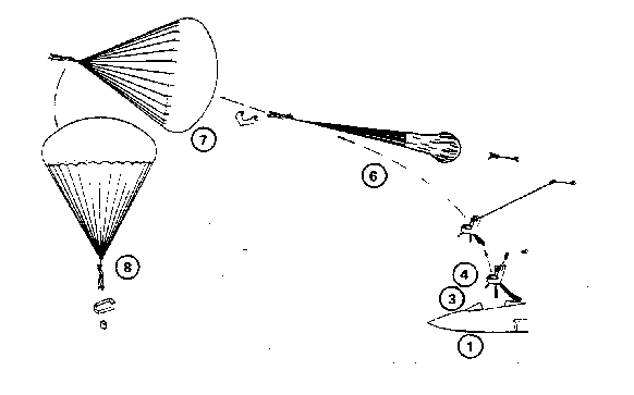 The recovery parachute and the drogue parachute subsystems are entirely independent. In the low-speed mode, Mode l, deployment of the recovery parachute is initiated as the seat and the crewmember are emerging from the cockpit. Thus, the elapsed time from ejection initiation to parachute inflation is minimized for the critical low-speed, low-altitude ejection conditions. In the high-speed mode, Mode 2, the drogue parachute is needed to slow the seat and occupant prior to recovery parachute deployment.