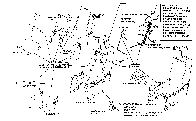 The Advanced Concept Ejection Seat (ACES II) is currently used in the A- l0, F- l5, F-l6, F-117A, B-lB, and B-2 aircraft and incorporates many of the advanced technology characteristics that have evolved in ejection seats. It has a zero-zero capability, deploying a useful chute with ejection on the ground at standstill. In low speed ejections, a gyro-controlled vernier rocket provides pitch stabilization. In high speed ejection conditions additional stabilization is provided by a drogue parachute. To achieve minimum-distance recovery in low-speed ejections, the recovery parachute is deployed as the seat leaves the cockpit. At high speeds, the drogue parachute is deployed immediately, quickly decelerating the seat and crewmember to a suitable speed for recovery parachute deployment. The use of multiple recovery modes permits the functions and timing of the recovery subsystem to be selected for each mode allowing optimum performance throughout the escape envelope.