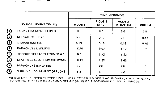 The weight of the pilot influences the performance of this system. Tests conducted with mannequins weighing as much as 247 pounds were successful with this system retaining its above 50 knots KIAS capability. Accelerative forces will vary according to the weight of the pilot, with pilots weighing in the 5th percentile experiencing l8-20 Gs and 95th percentile pilots experiencing l4-l6 Gs. Maximum recommended airspeed for ejection is 500 KIAS (2).