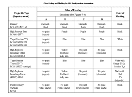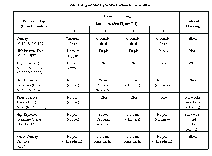 The color codes for the M50-configured 20-mm ammunition are listed. You can see exactly where colors are located on the projectile. The projectile is divided into sections marked A, B, C, and D. The sections on the projectile match the color code to columns in the figure. Also note the red T markings in the section B area just outside of the B1 section. The red T, and in some cases orange T, shows the presence of an incendiary explosive (tracer).