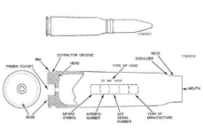 The cartridge components for M50-configured ammunition as used in a complete round are discussed in the following paragraphs. Cartridge Case The M103 (brass) and the M103B1 (steel) cartridge cases are marked longitudinally.