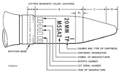 Ammunition is identified by the color the projectile is painted and by the lettering on the body of the projectile. Lettering The lettering is stenciled in waterproof marking ink around the body of the projectile. The first line of lettering identifies the caliber and type of cartridge; for example, 20MM HEI, 20MM TP, or 20MM HEI-T. The second line gives the cartridge designation; for example, M254, M55A2, or M220. The last line consists of a code number that identifies the manufacturer, interfix number, lot serial number, and year of manufacture. The color of the letters has no meaning.