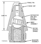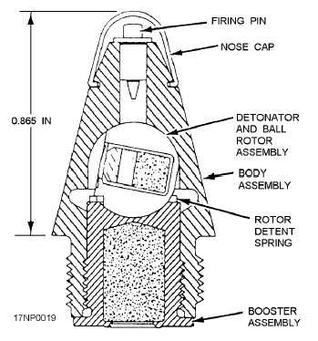 All projectiles, except the HPT, have essentially the same external configuration. The rotating band is a copper alloy swaged into a circumferential groove near the aft end of the steel body. Fuze M505A3 Point-Detonating (PD) The PD fuze consists of a body assembly, a rotor assembly, and a booster assembly. The fuze has a delayed arming distance of 20 to 35 feet after it leaves the muzzle of the gun. Before firing the HEI projectile, the rotor and the firing pin are locked in position by the rotor safety spring. (The rotor contains the detonator, which is out of line with the firing pin.) Centrifugal force causes the spring to open, allowing the rotor to move in-line with the firing pin. The fuze functions when the nose of the fuze is crushed against the target, forcing the firing pin against the detonator. The detonator, in turn, initiates the booster. The booster detonates and initiates the projectile's explosive charge.