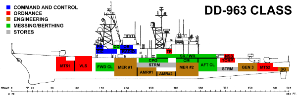 OB - OUTBOARD INTEL PH - PILOT HOUSE SG - STEERING GEAR ROOM SR / WR - STATEROOMS AND WARDROOM STRM - STOREROOMS TORP - TORPEDO MAGAZINE (PORT/STBD) TR - TORPEDO READY SERVICE LOCKER VLS - VERTICAL LAUNCHING SYSTEM |